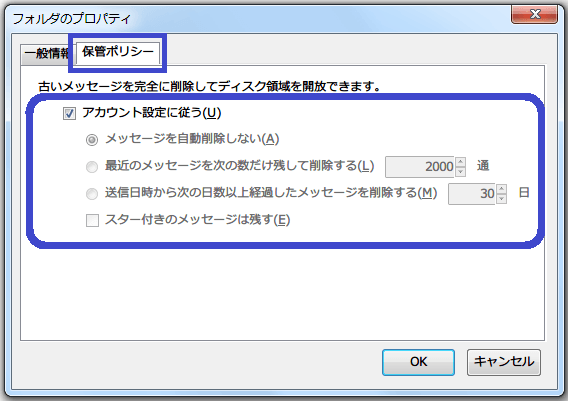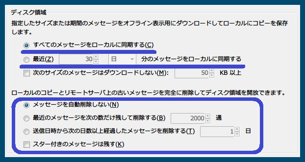 アカウントの設定にある [ダウンロードしてから 14 日以上経過したメッセージは削除する]