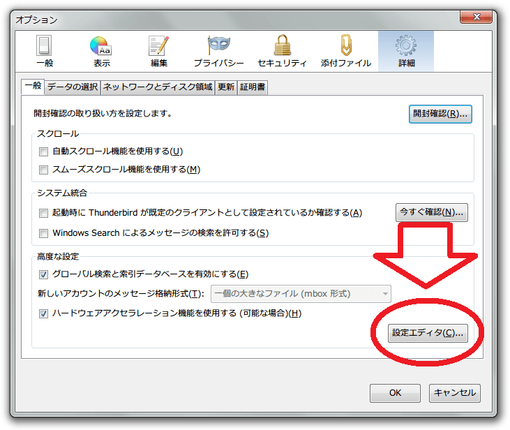 通常、Thunderbird では、どこであろうが about:config を入力して開くことはできないですよ。