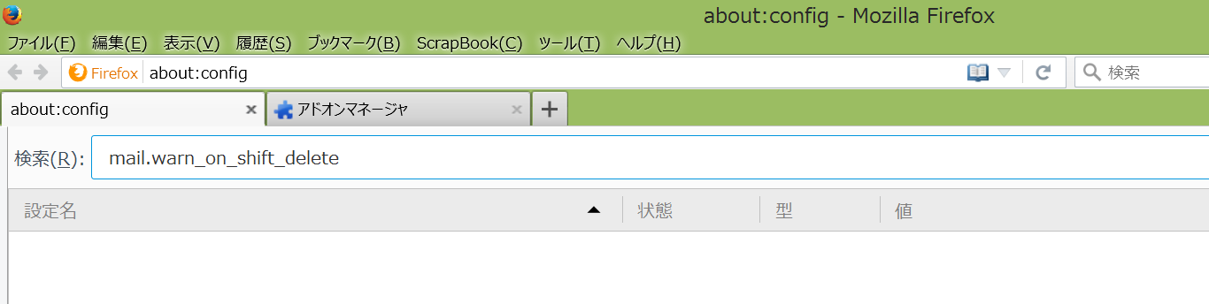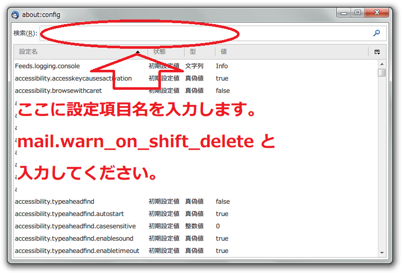 また、項目名はすでに明らかなので検索するのではなく、mail.warn_on_shift_delete を入力し