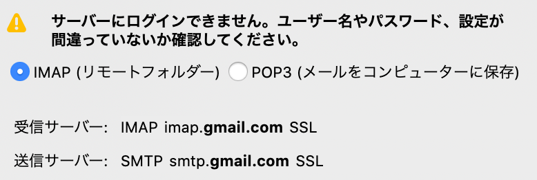 メッセージ:サーバー imap.gmail.com への接続時の認証に失敗しました。