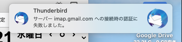 また、サンダーバード上ではログインできておりませんが、chrome上のgmailでは問題なくログインできてメールを確認できているので、ユーザー名やパスワードが間違っているということはありません。