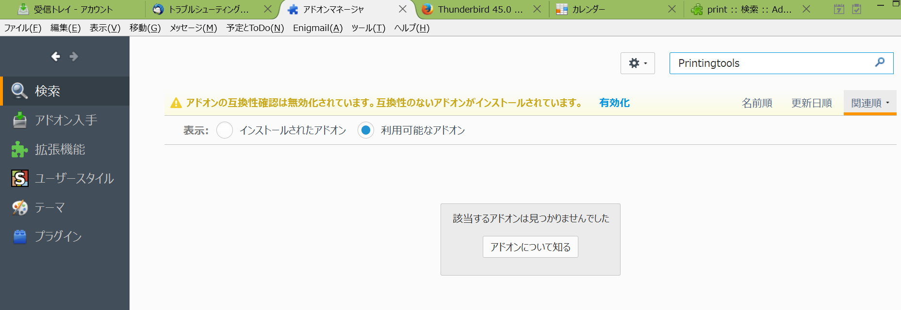 「該当するアドオンは見つかりませんでした」