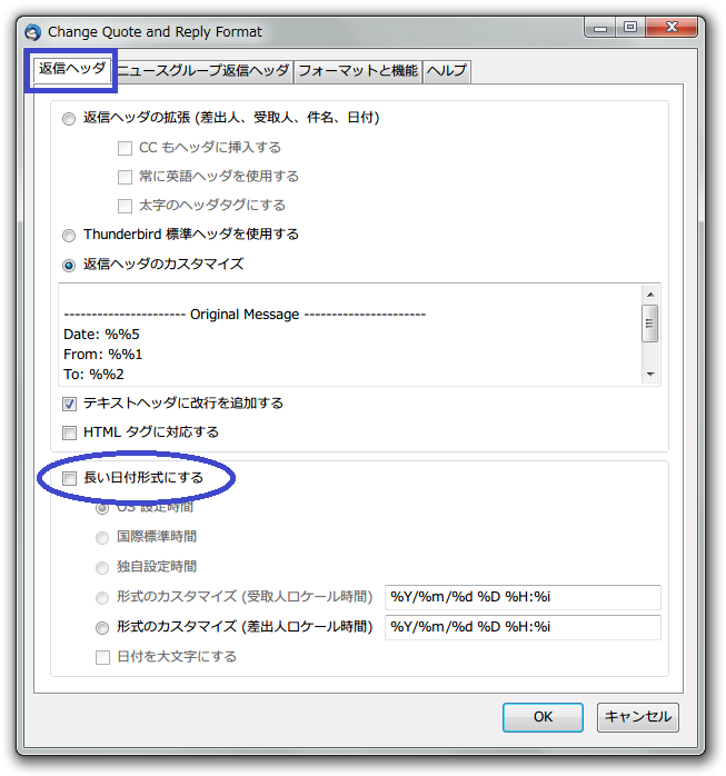 ・Change quote and reply format 0.8.1 の [返信ヘッダ] で、[長い日付形式にする] に