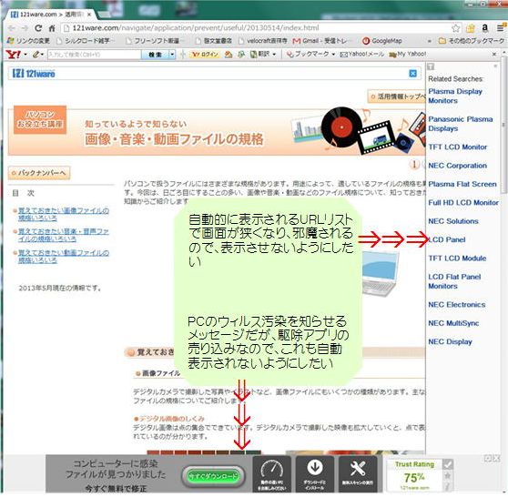 Yontooアドウェアというものは、ウイルスではないものの、不審なバナー広告でユーザーを不安に陥れたり、「Related Searches:」を表示させたりするもののようです。