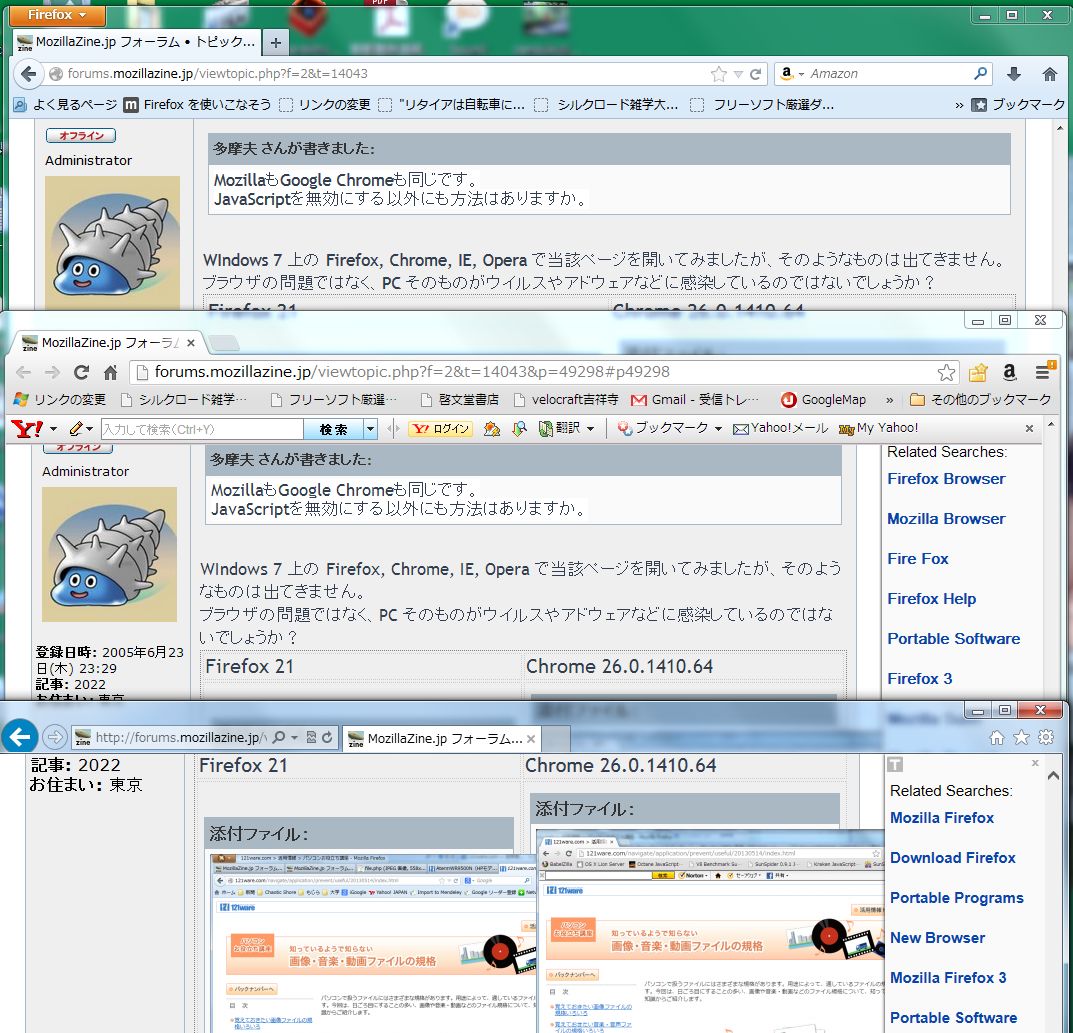 このようにブラウザ毎に症状が異なり、現在のところ正常に表示されるFirefoxのコミュニティーでサポートを受けるのも気が引けますが、最初にSOSしたコミュニティーでもあり、またFirefoxも元に戻ることも考えられるので、解決まで行きたいと思っています。よろしくお願いします。McAfeeを使っていますが、PC状態に問題は検出されていません。