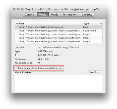 ありますよ。Mac 環境の英語版のためアサギさんの環境でのショートカットキーやメニュー項目が違うかも知れませんが、command + I か Tools → Page Info を開き Media タブ下方の "Block image from xxx.hogehoge.com" にチェックを入れると画像や動画をブロックできます。