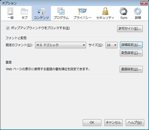 ツールバーの「ツール」から「オプション」を選択し、その中の「コンテンツ」のところを見ると、
