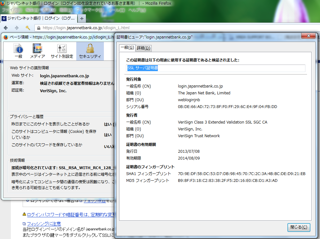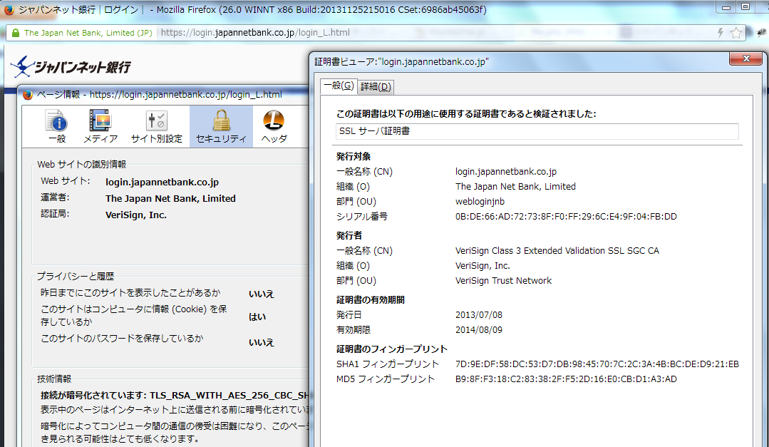 コメント: Firefox 26.0 Beta 8 でジャパンネット銀行ログイン画面にアクセスしたときの SSL 情報