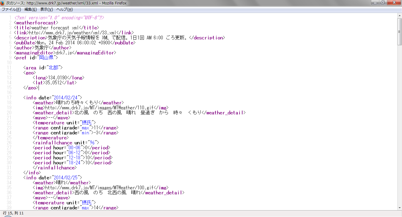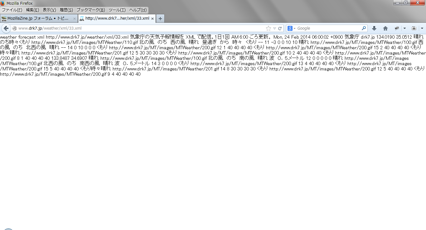 少なくとも当方の環境では、Firefox 27.0.1 / 24.3.0ESR をはじめレンダリングエンジンが異なる複数のブラウザで、当該サイトの「Japan Weather Forecast xml (日本お天気予報)の配信リスト」にある都道府県別の XML ファイルをいくつかランダムに開いてみましたが、すべてのブラウザで添付画像の上の方の表示(ツリー表示)になっていました。