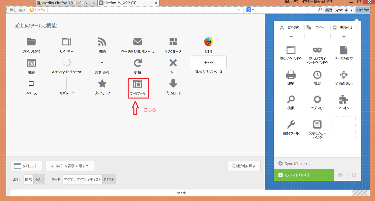 ツールバーの表示を「テキストのみ」にしているスクリーンショットが