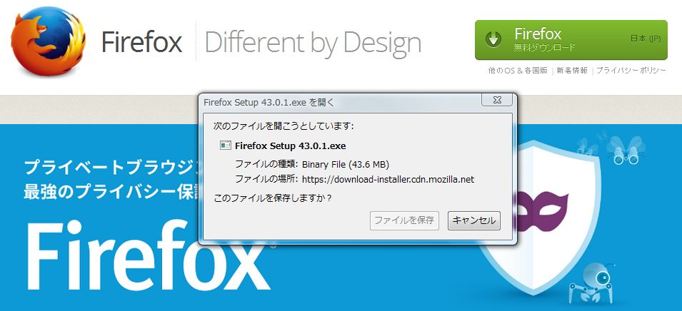 Firefoxのダウンロード(https://www.mozilla.org/ja/firefox/new/)で「無料ダウンロード」をクリックいたしましても、ダウンロードされるファイルはFirefox Setup 43.0.1.exeでした。