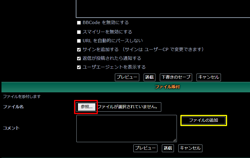 投稿(返信)時のフォーマットの直下にあるファイル添付での「ファイル名」の [参照...] ボタン(画像の赤枠部)を押下し、