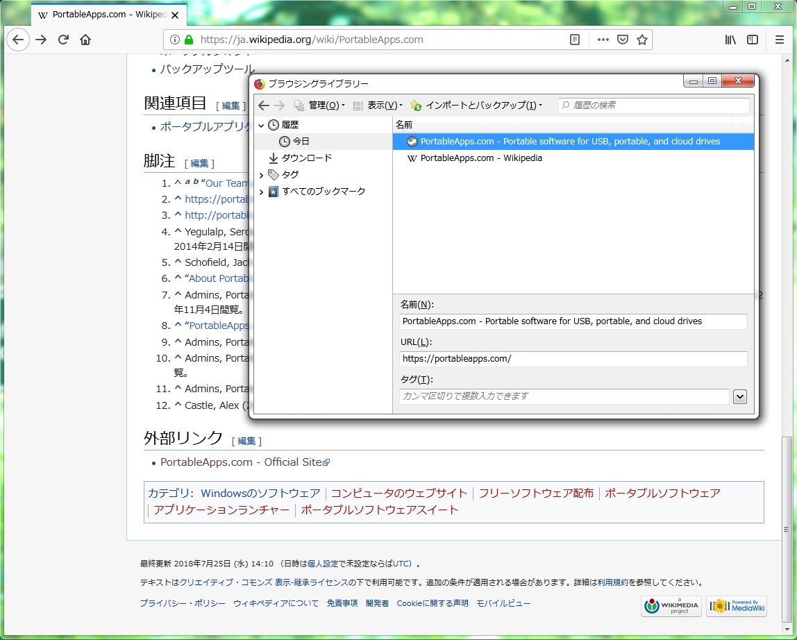 の履歴項目を選択して、右クリックから [このサイトの履歴を消去] を選択すると、http と https の2つの portableapps.com の項目が消去されます。