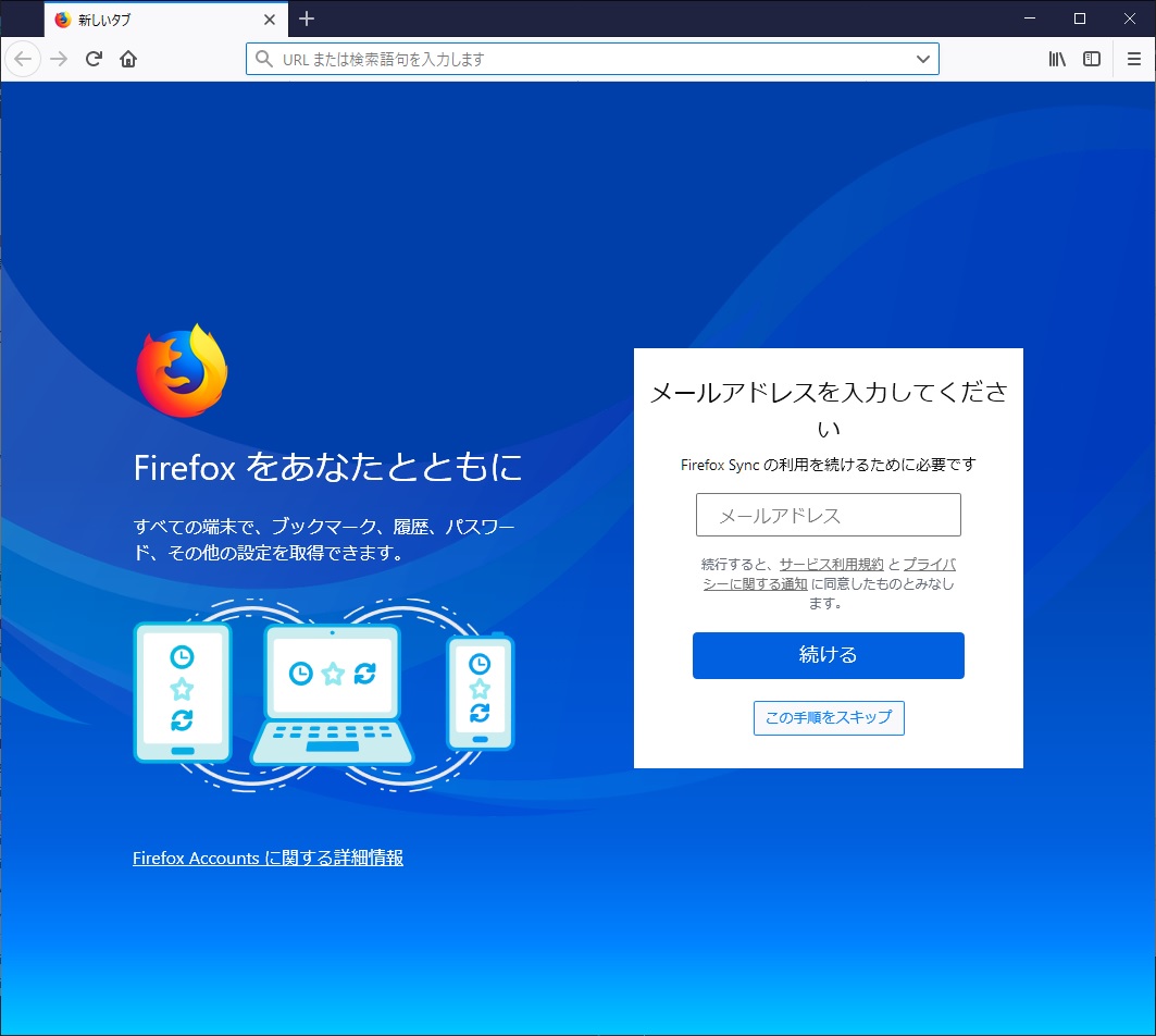 Firefoxを始めて起動すると下記のような画面が表示され、Firefox Syncを利用するためにメールアドレスを入力するように促されます。