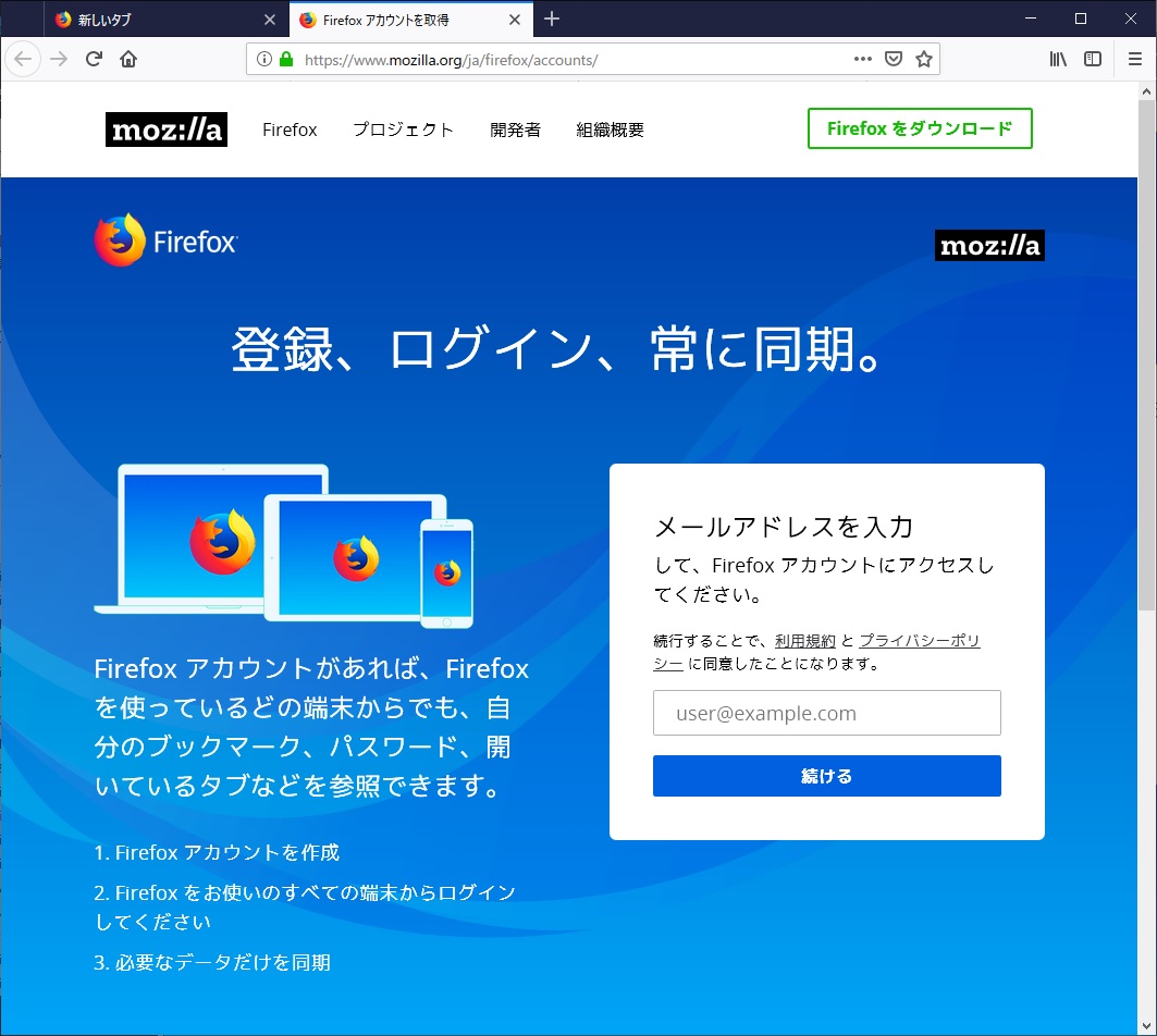 Firefoxアカウントは、複数のFirefoxの環境を同期させる Firefox Sync や、その他の Mozillaのサービスを利用するためのものです。