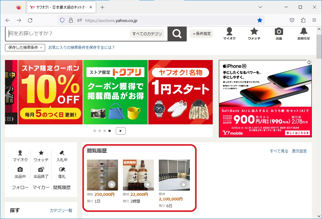 新規プロファイルの Firefox 110.0 環境 にてヤフオクを閲覧してみました。