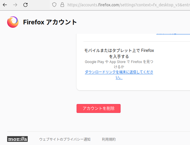 Firefoxアカウントはログアウトでなく、アカウント削除しています。