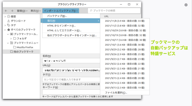 ②Firefoxではブックマークの自動バックアップもローカルに15サイクル分とられている事もあいまって、