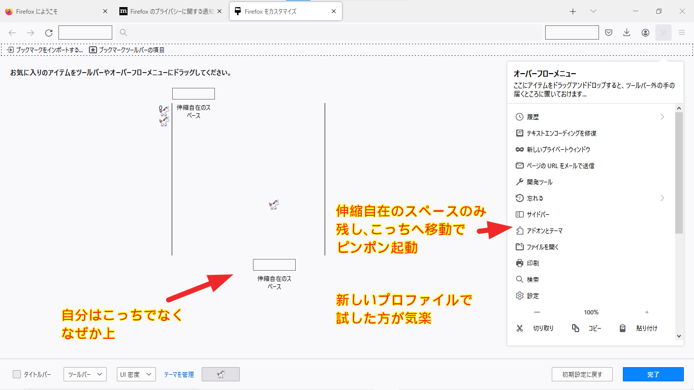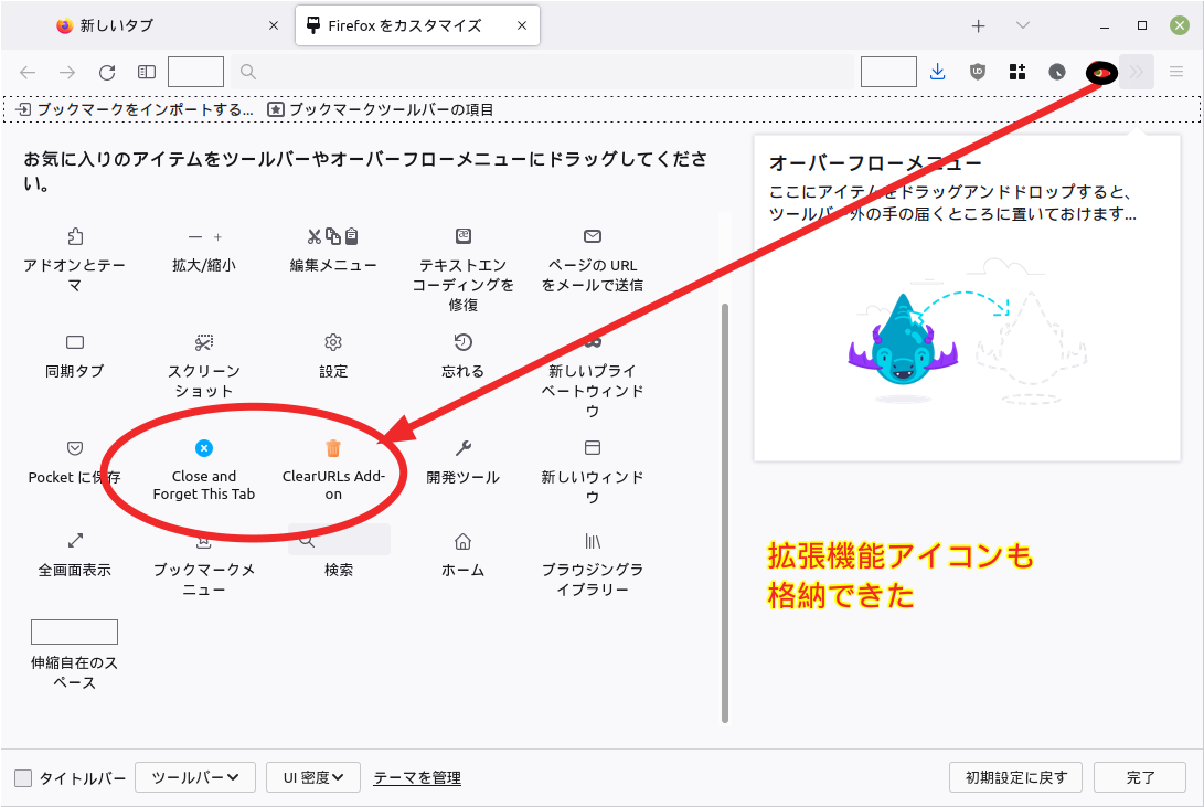 Firefoxは有効中の拡張機能アイコンを選んで非表示にできないのか...と思っていたら、