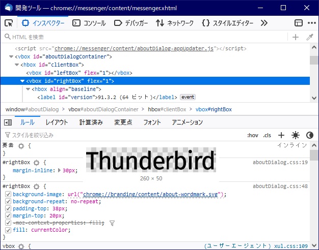 Windows のカラーテーマをダークにし、アクセントカラーを濃紺に調整して「Mozilla Thunderbird について」を出してみました。