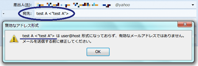 「[アドレスリスト名] は user@host 形式になっておらず、有効なメールアドレスではありません。メールを送信する前に修正してください。」