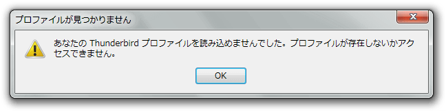 「あなたのThunderbirdプロファイルを読み込めませんでした。プロファイルが存在しないかアクセスできません」と表示されます。