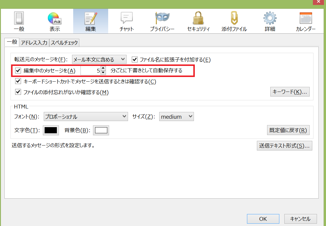オプションの設定にて、下書きを自動保存する機能もあります。