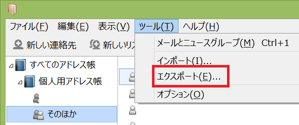 上記各ファイルは新環境への単純コピーで移行が可能ですが、もしabook.mabやhistory.mab以外にアドレス帳を作成していた場合は、予めアドレス帳画面ののツール→エクスポートにて、アドレス帳をエクスポートしておく必要があります(新プロファイルで再度アドレス帳をインポートしなおす)。
