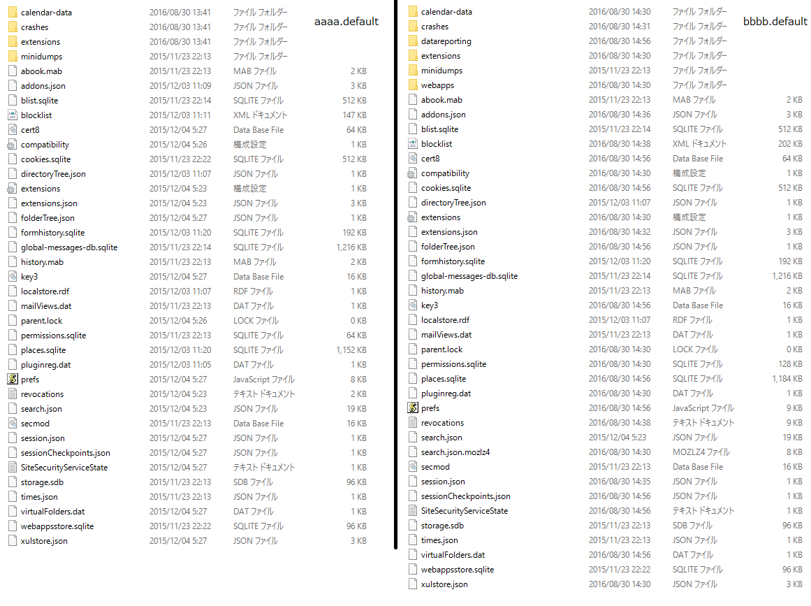 中央の線を境に左はaaaa.default(旧環境からコピーしてきた中身そのまま)で、右はbbbb.default(Thunderbirdの再起動により書き換わってしまった現状)です。