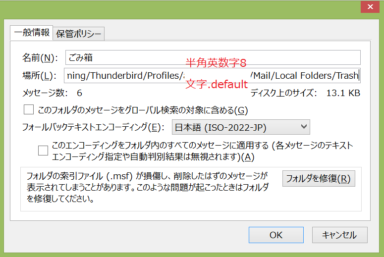 Thunderbird上の「ごみ箱」- プロファイルフォルダ内のTrash・Trash.msf