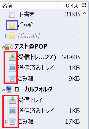 これらのうち、受信トレイ・送信済みトレイ・下書き・ごみ箱・といった固有のフォルダは、Thunderbird上で特別な役割が存在し、アイコンも固有のものになります。