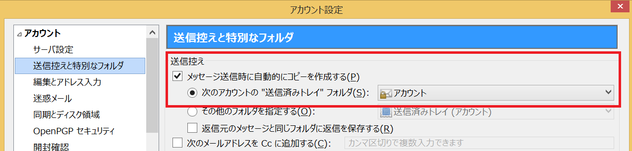 まず、自分が書いて送ったメールが送信済みトレイに入る(コピーされる)ための設定があります。