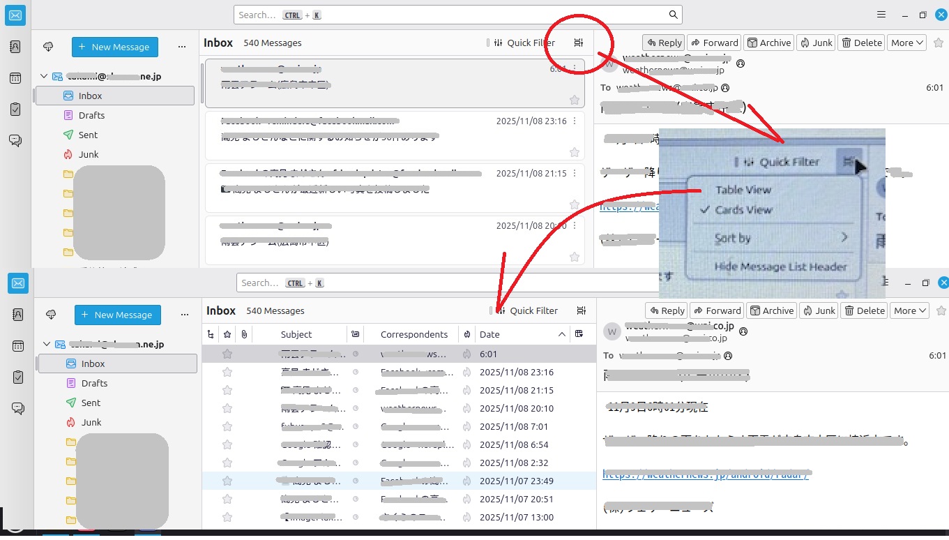 これを「テーブルビュー」にすれば1メールが1行表示になるらしいのですが、私の
