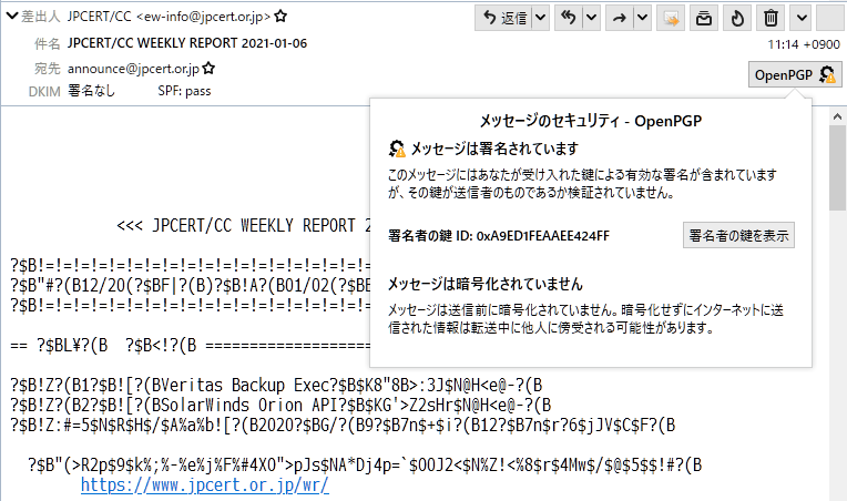 Thunderbird 85.0b3 では、PGP鍵の受け入れ後も JPCERT/CC WEEKLY REPORT のメールを文字化けせずに表示できました。