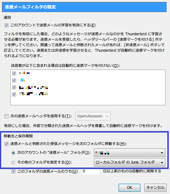 「迷惑メールと判断された受信メッセージを次のフォルダに移動する」で、移動先