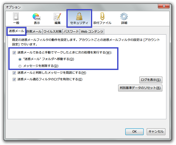 【"オプション" での設定方法】[ツール](Mac OS X:環境設定) > [オプション] > [セキュリティ] > [迷惑メール]