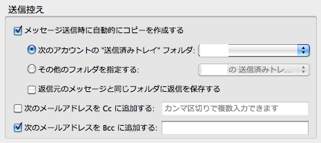 アカウント設定内の「送信控えと特別なフォルダ」内に、「次のメールアドレスを