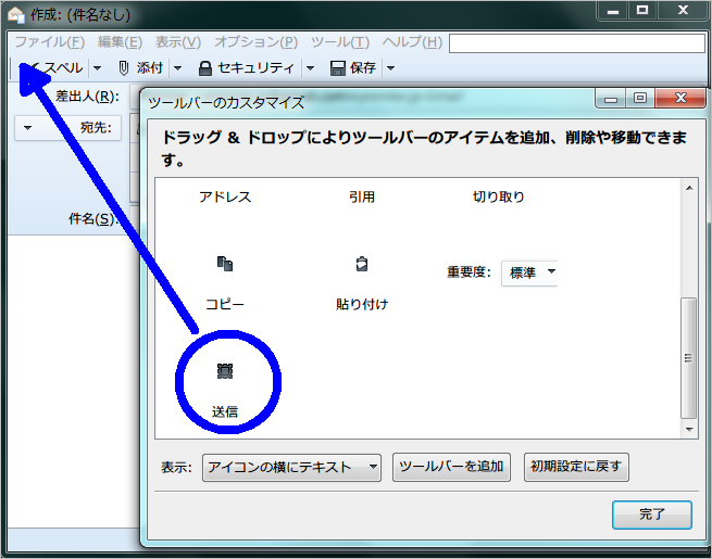 [送信] アイコンを編集ツールバーなどのお好きな場所に、ドラッグ&ドロップするか、
