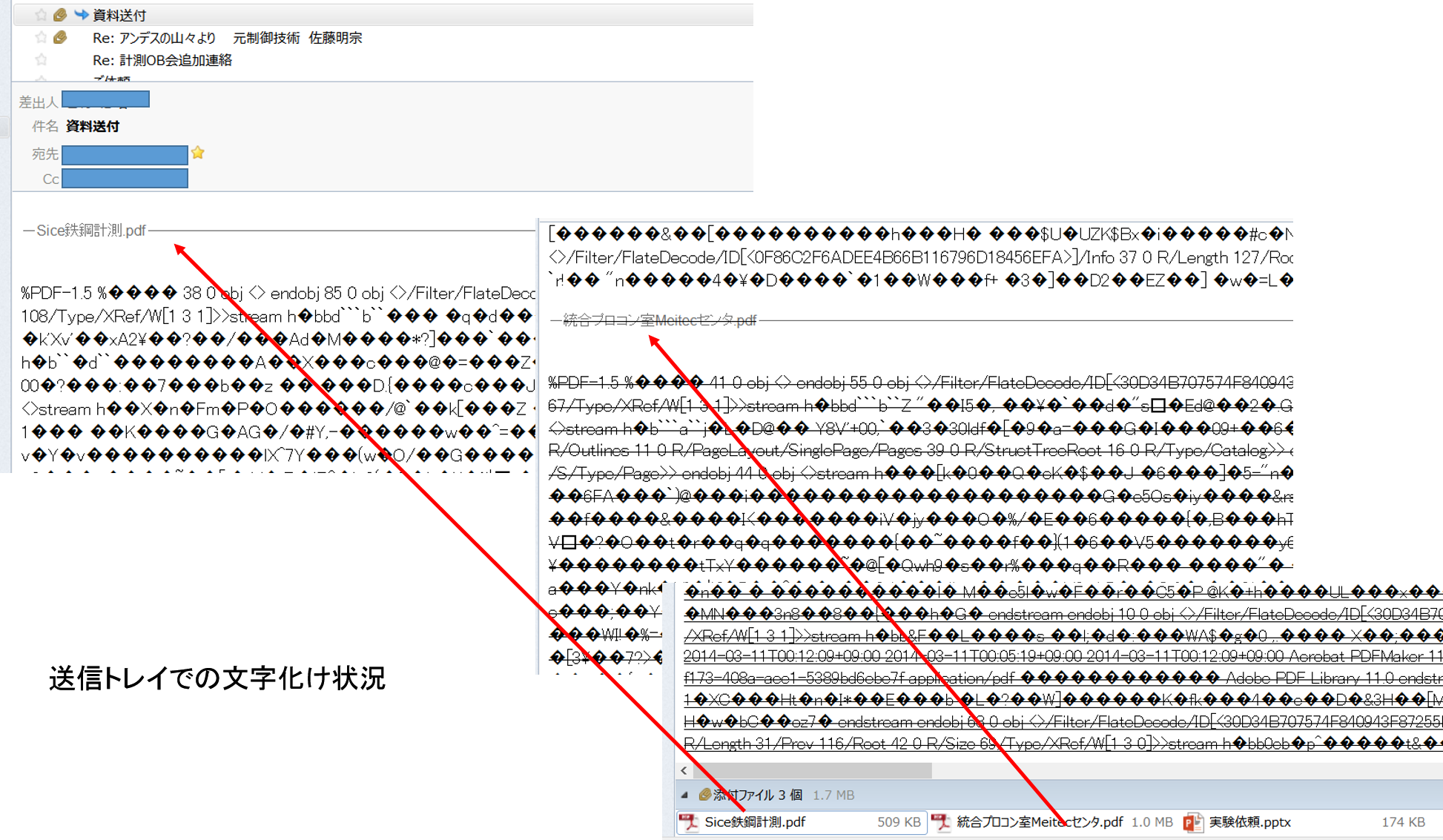 PDF や PPT、PPTX ファイルが、メッセージ本文内に文字化けのように表示されるのは、正しい