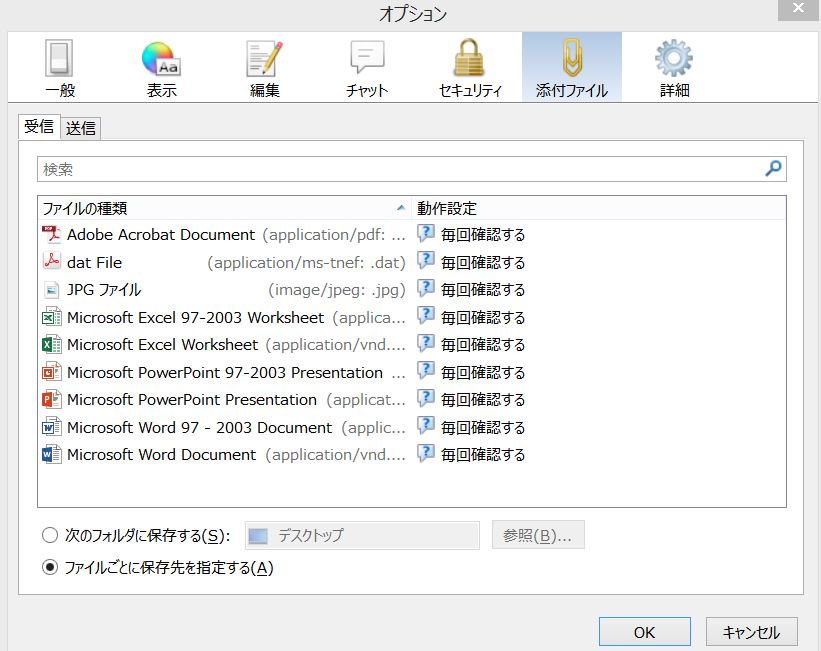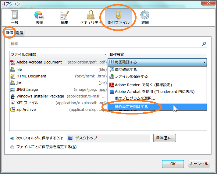 修正方法は、いくつかありますが、Thunderbird の [オプション] > [添付ファイル] > [受信] >
