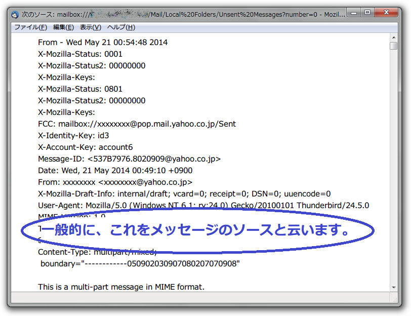 4.該当メッセージを Thunderbird のソース表示で、どうなっているか確認してみましょう。