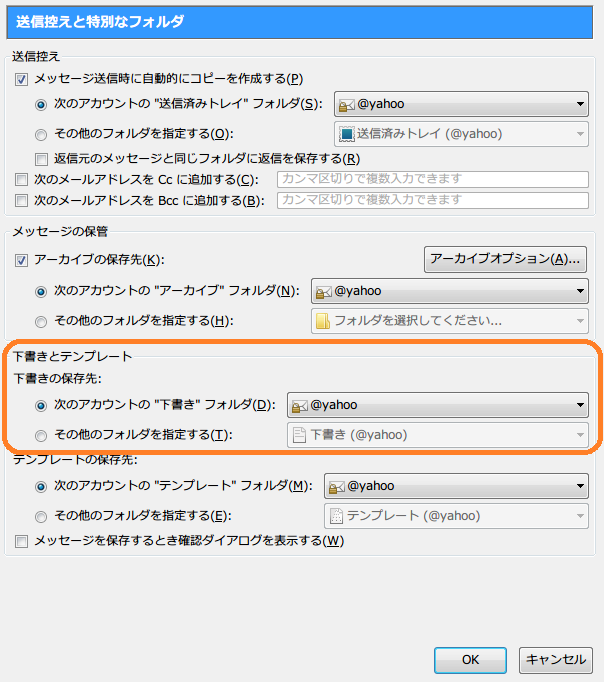 該当のアカウントのアカウント設定にある [送信控えと特別なフォルダ] > [下書きとテンプレート] >