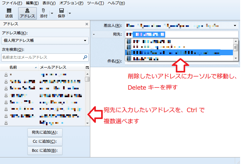 そして肝心の、その不要メルアド消去方法、教示通りに青転させてデリート・キーを押すのですが、単にそれを選択したことになり、送先欄に表示されることになるのみです。ここが未だうまく消去できるようにはなっていません。お暇の折り再度教示願えれば幸いです。よろしく。因みにOS Win8.1、   今気が付きましたが、スクリーンショットで例示していただいている画面はThunderbird画面ではないようですね。インターネットのどこかの画面で、Thunderbirdを調整することになっているということでしょうか。INET、PCともに疎い者で申し訳ないです。よろしく。