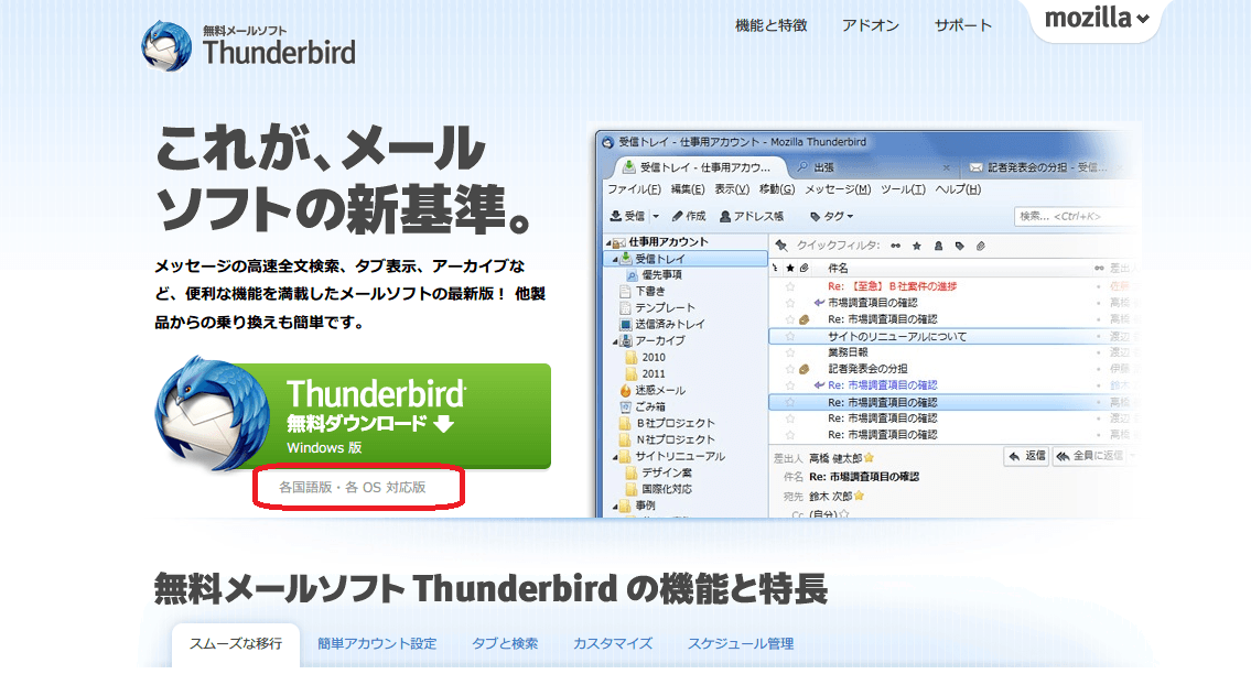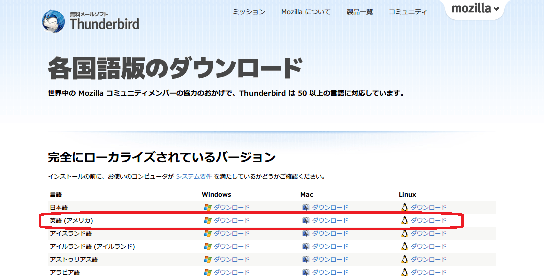 場でもあります。 下記の Mozilla Japan の Thunderbird ページに各国語版へのダウンロードリンクの案内があります。