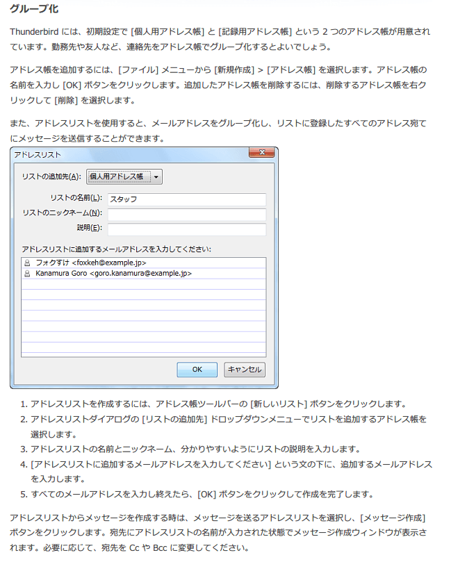 CSV 形式で作成する場合は、Thunderbird のアドレス帳のフォーマットに合わせたものにする