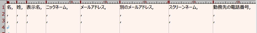 テキストエディタで CSV 形式のアドレス帳の連絡先を表示させたものです。