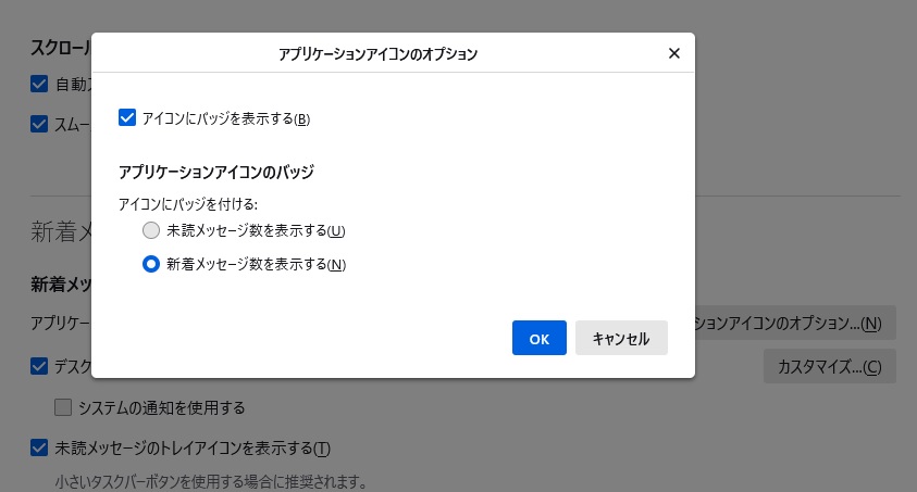 サブフォルダーに振り分けた新着メールに対して、タスクバーのアイコンのバッジ表示がされないということですね。