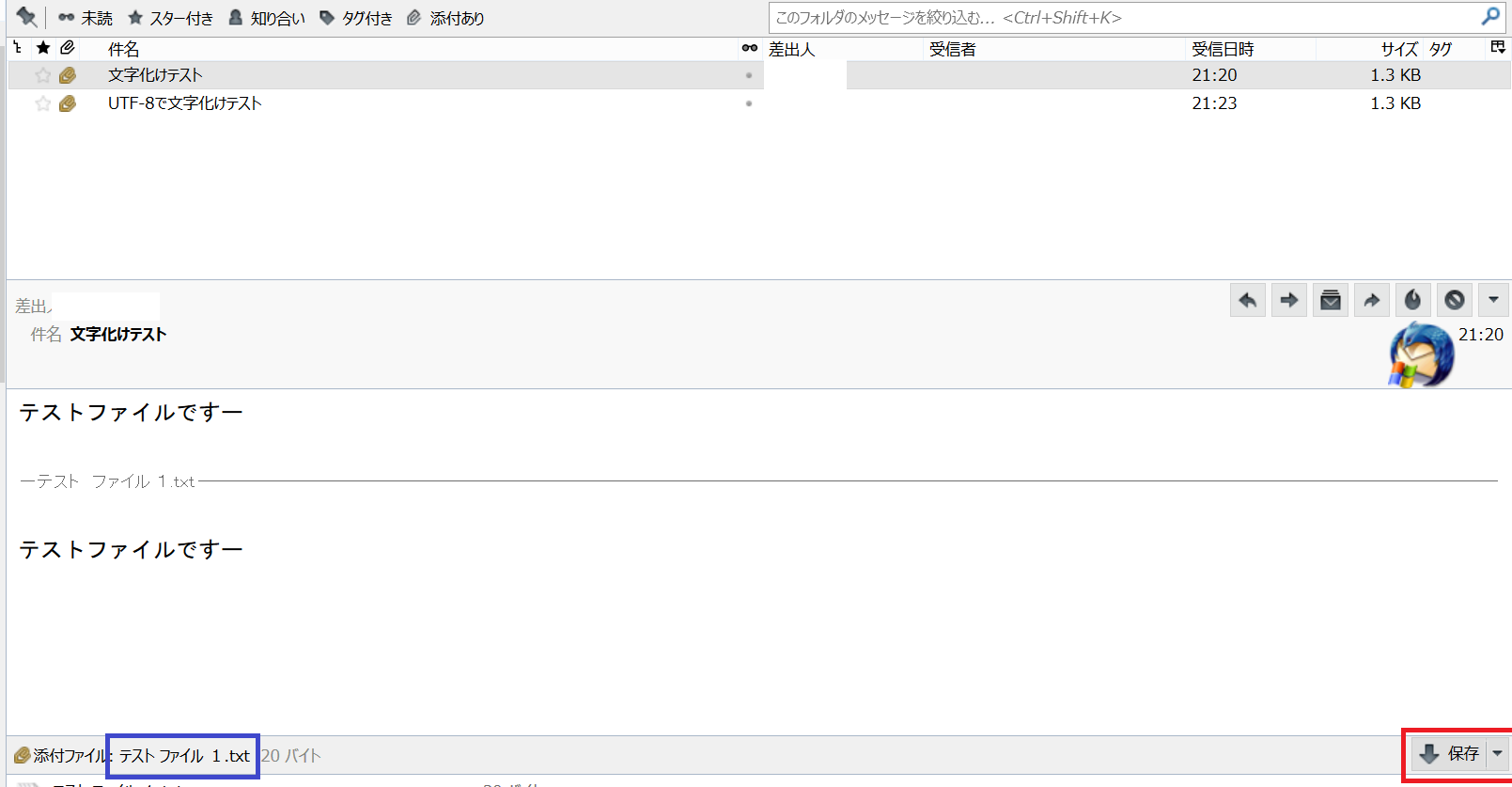 同じ「テスト ファイル 1.txt」という添付ファイル付きのメッセージの送受信でテストして