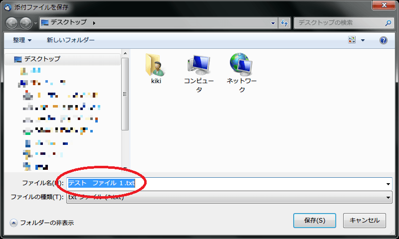 青枠(ファイル名)をクリックして保存しようとすると、本来「テスト ファイル 1.txt」と保存されるべきところが「テスト%u3000ファイル 1.txt」と一部化けてしまいます。