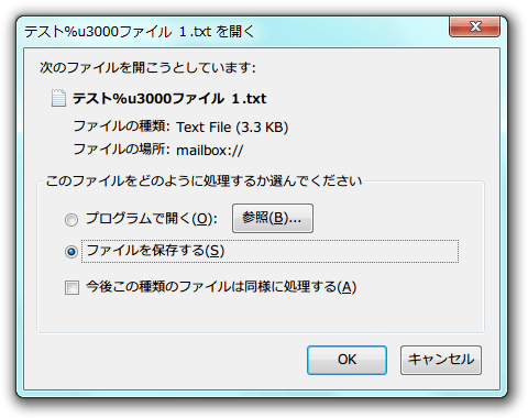 ・添付ファイルの保存では、添付ファイル名のエンコーディングが UTF-8 でも、ISO-2022-JP でも、[開く] コマンドから実行(1)すると「テキスト%u3000ファイル 1.txt」となりました。